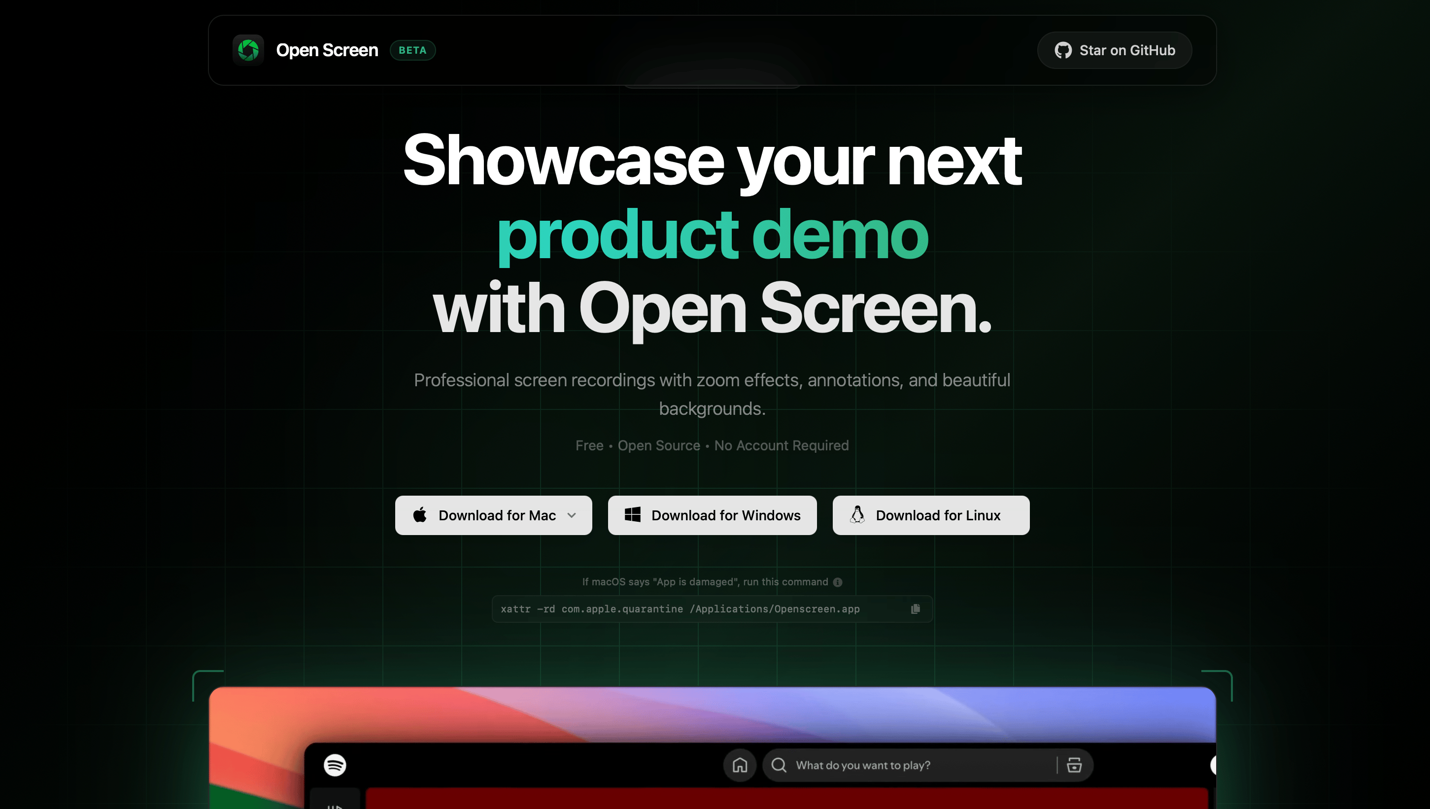 Open Screen is a free and open source screen recording software and alternative to Screen Studio. You can create professional screen recordings with zoom effects, annotations, and beautiful backgrounds. Works on Mac, Windows, and Linux.